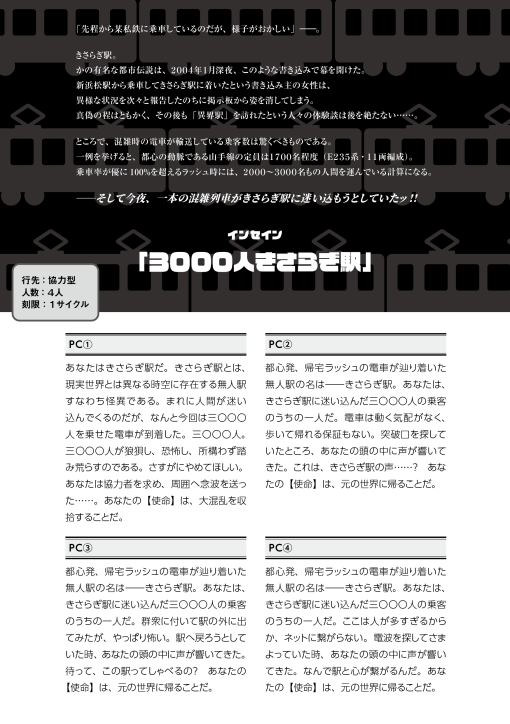 このシナリオは、「本当は怖い現代日本」のセッティングを使用します。異世界に存在する小さな無人駅「きさらぎ駅」と、その周辺が舞台です。人が多すぎるために電波状況が悪く、インターネットやGPSは利用できません。シーン表は、「3000人きさらぎ駅シーン表」を使用してください。